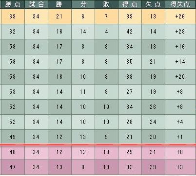 負けが多いが引き分けが少なかったので優勝出来たようです。