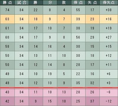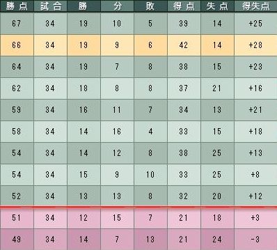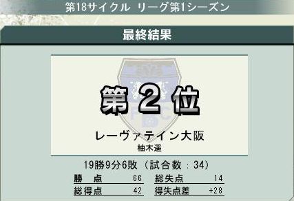 一時は首位に立ったのにレッドカードもらったりで33節で逆転され勝ち点差12位に終わりました。